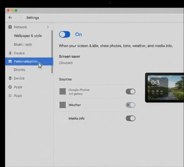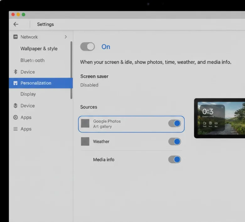 Toggle the switch to “On” for your screen saver. The description reads: “When your screen is idle, show photos, time, weather, and media info.” This mirrors the core functionality of Google Nest displays.