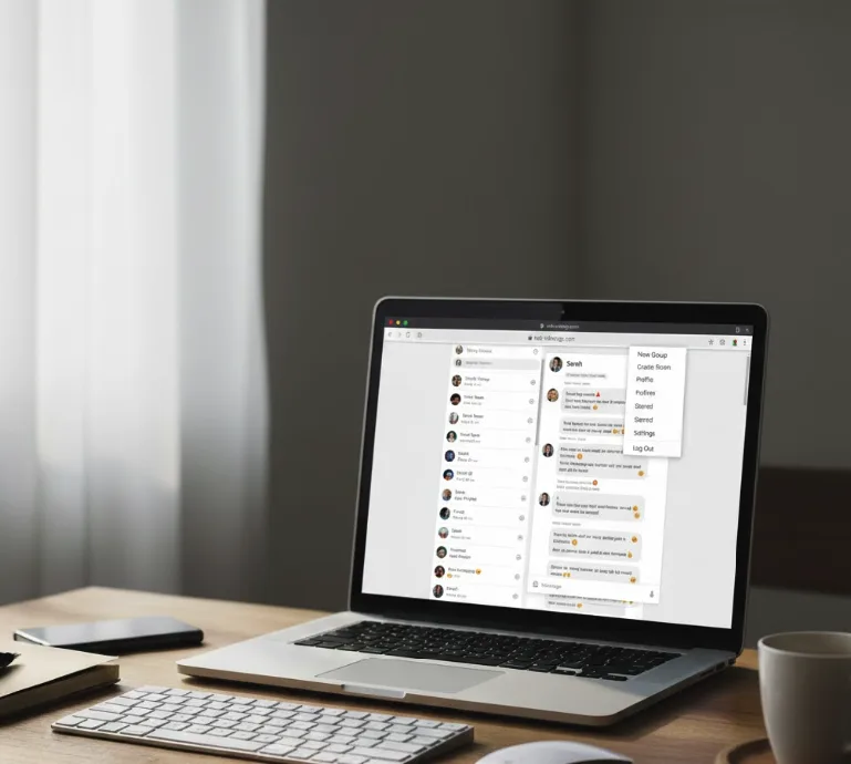 Click any contact or group to open a conversation. Type messages using your keyboard and press Enter to send. Use the paperclip icon to attach photos, videos, or documents. Click the emoji icon to add emojis, GIFs, or stickers to your messages. The microphone icon lets you record and send voice notes.