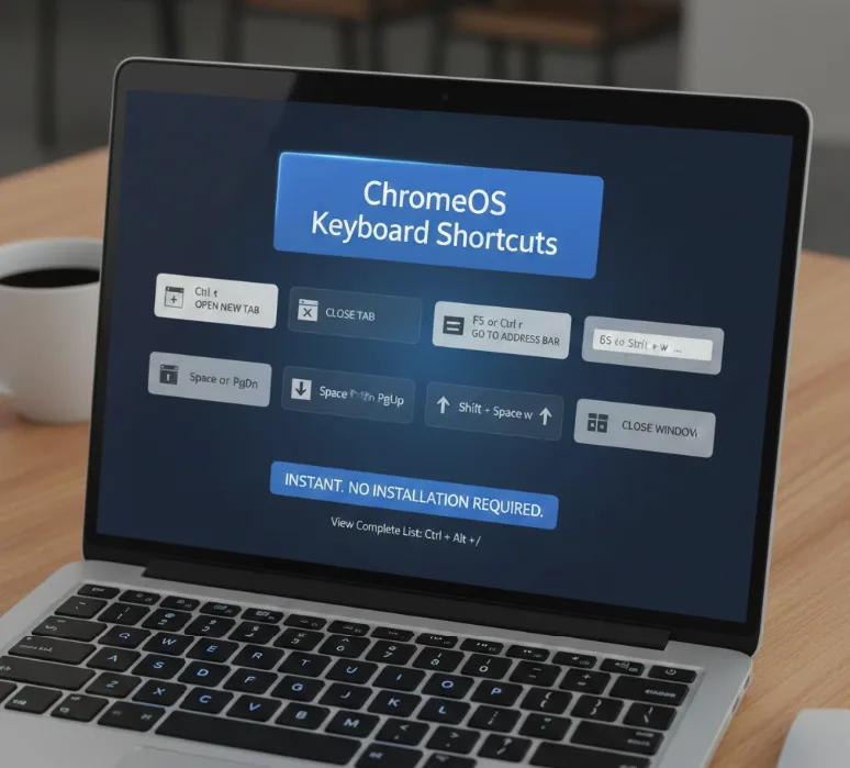 These shortcuts work immediately on your Chromebook without installing anything. You can view the complete list of keyboard shortcuts by pressing Ctrl + Alt + /.